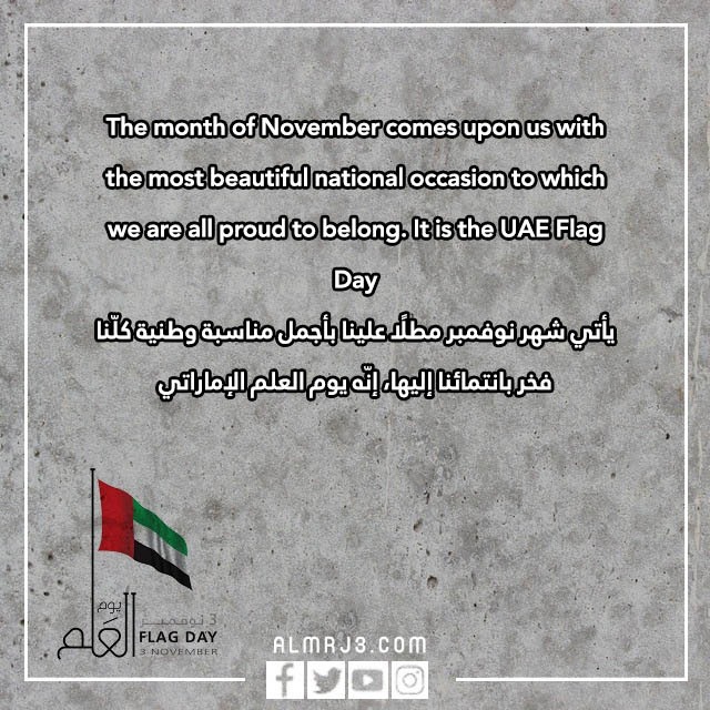 - الترجمة: هنيئًا لدولة الإمارات حلول يوم العلم الإماراتي، وهنيئًا لنا انتماؤنا إلى هذه الدولة العظيمة.