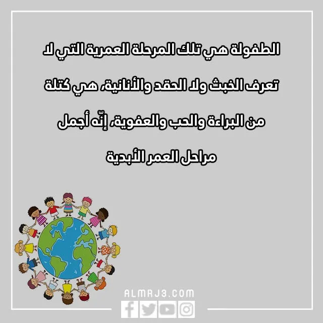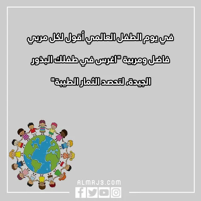 الترجمة: إنّ يوم الأطفال العالمي هو أمانة بين صدورنا، لا بدّ من الوقوف معها بالأفعال، بالسّعي والعمل والكلمة الجميلة، فحاولوا إسعاد أكبر عدد من الأطفال في هذا اليوم. - العبارة: The child is the spring butterfly of intent that stores between its wings the purity of the world and the innocence of the world. Do not allow sorrows to extinguish this passion in them, for childhood has suffered enough pain.