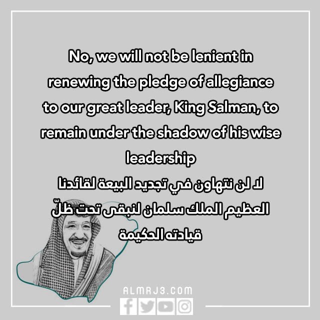 - الترجمة: بالحب والفخر والسرور نجدد البيعة والولاء لجلالة الملك سلمان بن عبد العزيز.