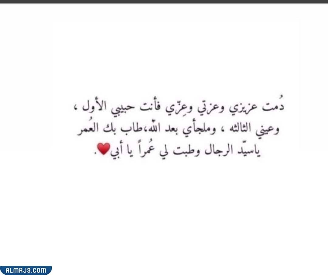 - أبي، يا سكينة قلبي وطمأنينة روحي، يا تاجًا من العزّ والوقار، كم أفتخر عندما يلحقون اسمي باسمك، أنت رمز الفخر والكبرياء، أحبك كثيرًا يا أبتي.