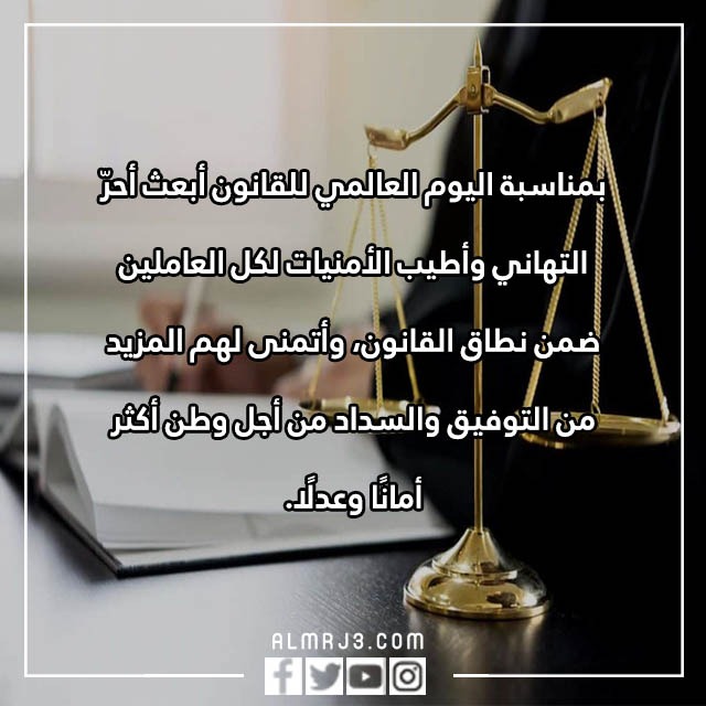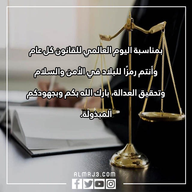 - في اليوم العالمي للقانون أرسل لك يا صديقي العزيز أجمل الأمنيات والدعوات الطيبة بأن يحفظك الله من كل سوء، وأن يبارك بهمتك وجهدك المبذول من أجل تطبيق القانون على الجميع.