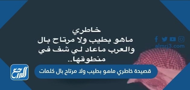 قصيدة خاطري ماهو بطيب ولا مرتاح بال كلمات يهتمّ كثيرون بسماع الأغاني والموسيقا التي قد تنال إعجابهم، حيثُ أنّ كلّ شخص يجذبه نوع معيّن من الأغاني أو ما يُعرف بالشّيلات في المجتمعات الخليجيّة، مما يجعلهم يبحثون عن كلمات تلك الأبيات الشّعريّة المكتوبة والمحكيّة بطريقة طربيّة لطيفة في حال لم تكُن واضحةً بالنّسبة لهم، لذا ومن خلال موقع المرجع سنوضّح لكم كلمات قصيدة خاطري ما هو بطيّب ولا مرتاح.