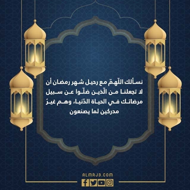 | دعاء رحيل شهر رمضان | نسألك اللّهمّ مع رحيل شهر رمضان أن لا تجعلنا من الّذين ضلّوا عن سبيل مرضاتك في الحياة الدّنيا، وهم غيرُ مدركين لما يصنعون. |