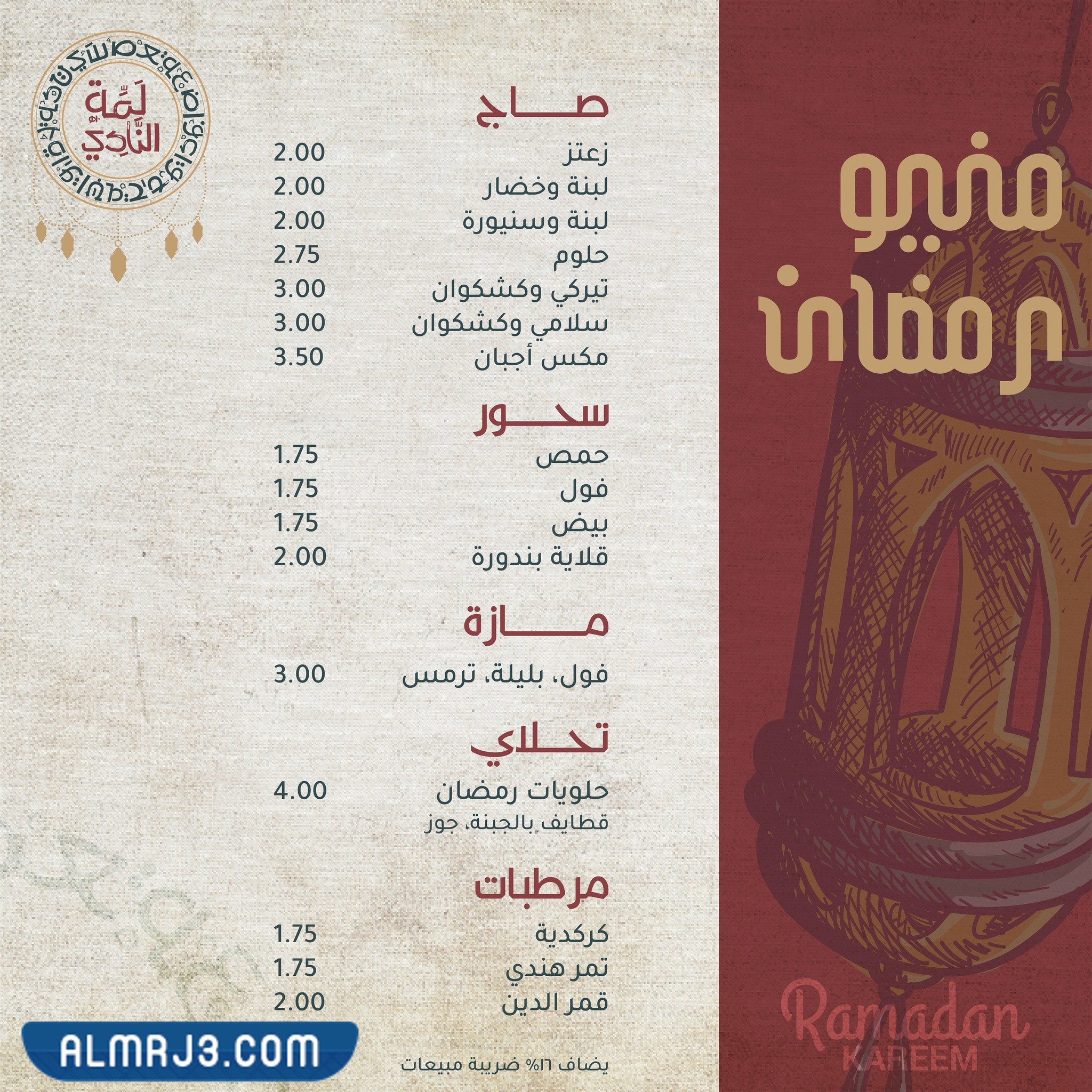 الفول والبيض والحمص والالجبنات والمعجنات وحلويات رمضان من قطايف وغيرها كلها وأكثر متاحة في بوفيه مطعم لمة النادي الذي يقدم أسعار خاصة للسحور الرمضاني، وللتواصل:[3]