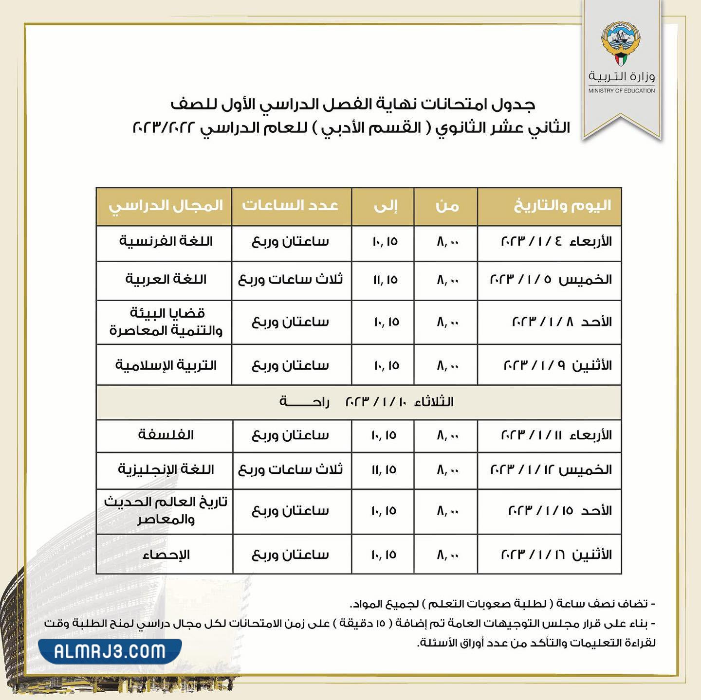 - جدول امتحانات نهاية الفصل الدراسي الأول للصف الثاني عشر الثانوي قسم أدبي.