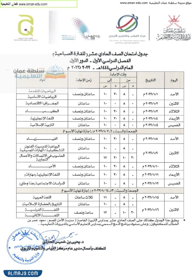 - 1.5 جدول الاختبارات النهائية سلطنة عمان للصف الحادي عشر 2023