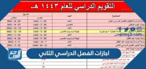 إنّ جَداول اجازات الفصل الدراسي الثاني 1446 يتم اعتمادها عبر وزارة التَّعليم في المملكة العربيَّة السعوديَّة، ويجري ذلك بالاستناد على تقويم العام الدراسي الجديد 1446 هــ وتقويم الفَصل الدراسي الثاني، حيث يتم توزيع المواد والمقرّرات في هذا الفصل بما يَتماشى مع الوقت المحدّد، وذلك لضمان توحيد الجُهود للوصول إلى أفضل نتائج، حيث يحظى الطّالب بعدد واسع من الاجازات التي تختلف بين اجازات نهاية اسبوع مطوّلة وعطل نهاية فصول دراسيّة واجازات رسميّة وغيرها، وعبر مَوقع المَرجع يمكن للطالب والمعلّم الاطَّلاع على جدول اجازات الترم الثاني 1446 وعلى جدول تقويم العام الدراسي بالأسابيع 1446.