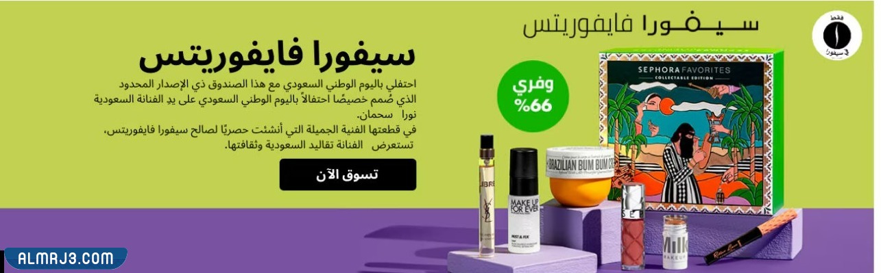 تقدم سيفورا عروضاً خاصة بمناسبة حلول ذكرى اليوم الوطني الرابع والتسعين لعام 2024م – 1446هـ، حيث يمكن للعملاء الحصول على صندوق سيفورا فايفوريتس اليوم الوطني السعودي بسعر 200.00 ر.س. عوضًا عن 583.00 ر.س. وهو صندوق ذي إصدار محدود صُمم خصيصًا احتفالاً باليوم الوطني السعودي على يدِ الفنانة السعودية نورا سحمان، يحتوي الصندوق على: