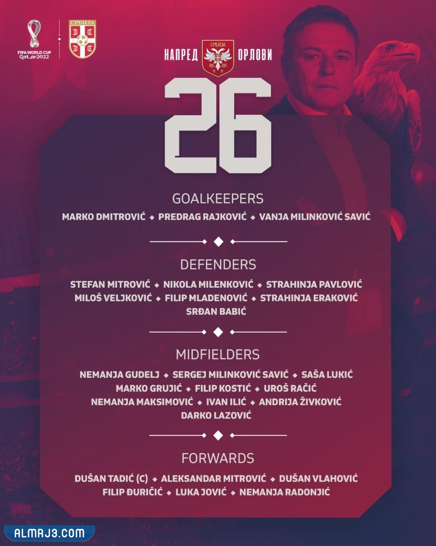 أعلن دراغان ستوي كوفيتش المدرب الوطني لمنتخب صربيا “يوغسلافيا سابقاً”؛ القائمة النهائية للمنتخب المؤلفة من 26، وهي كالآتي: