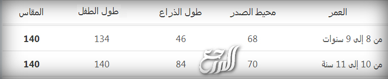 | عمر عشرة أعوام | 34.0 سنتيمتر | 43.0 سنتيمتر | مقاس 140 |