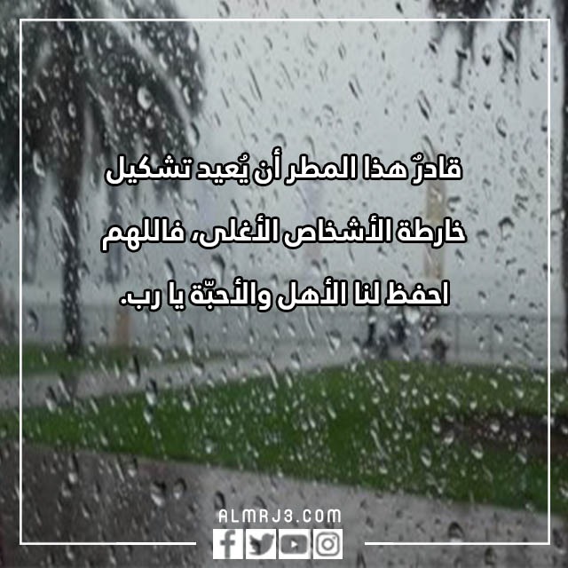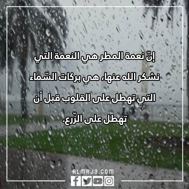 | العبارة الثانية | إنّ نعمة المطر هي النعمة التي نشكر الله عنها، هي بركات السّماء التي تهطل على القلوب قبل أن تهطل على الزّرع، فاللهم أكرمنا بما أنتَ له أهل، ولا تعاملنا بما نحن أهله. |