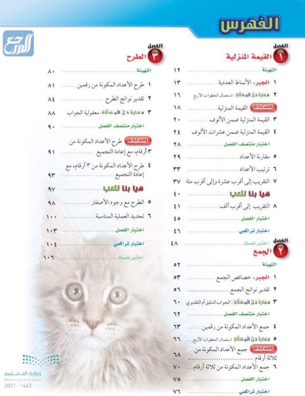 فهرس كتاب مادة الرياضيات يوضح أهمية الدروس المُنتقاة بخبرة عالية لطلابنا لإضافة مهارات حسابية لهم وتوسيع أفق مداركهم، ومنها محتويات درس القيمة المنزلية وعدد المنازل الرقمية مثل منزلة الآحاد والعشرات والمئات وغيرها، لذلك يتمتع طلبة الصف الثالث الابتدائي بمحتوى وفير من الدروس المهمة للفصل الاول 1443 في المنهاج المطور لتعليم يخرج أجيال بذكاء خاص.