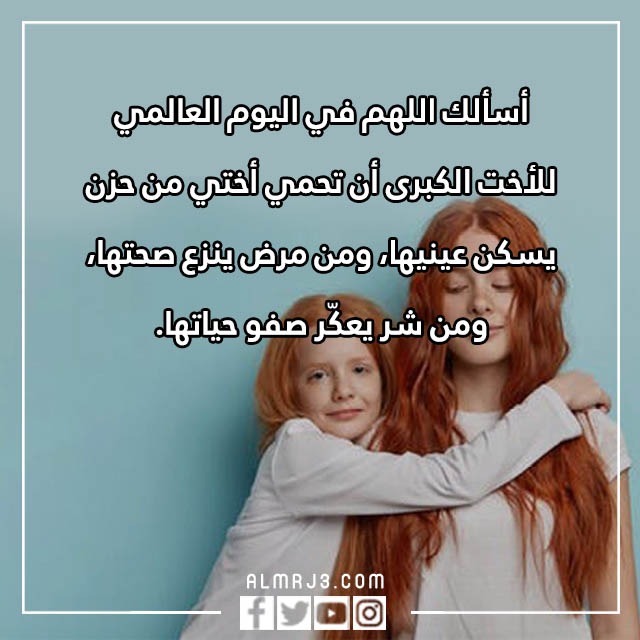 - أسألك اللهم في اليوم العالمي للأخت الكبرى أن تحمي أختي من حزن يسكن عينيها، ومن مرض ينزع صحتها، ومن شر يعكّر صفو حياتها.