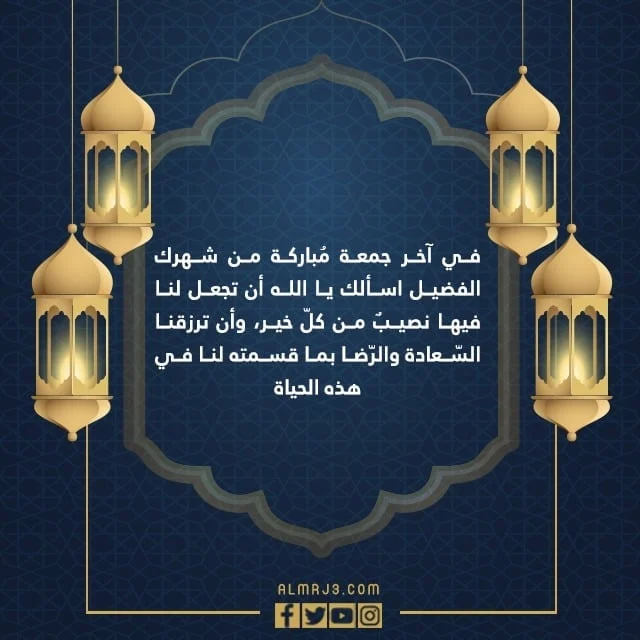 - إنّ اخر جمعة من شهر رمضان المُبارك هي إحدى نوافذ الخير التي نُرسل معها أطيب الدّعوات إلى رب العرش العظيم، فاللهم لا تصرفها عنّا إلّا وقد غفرت لنا ما تقدّم من ذنوبنا وما تأخر يارب.