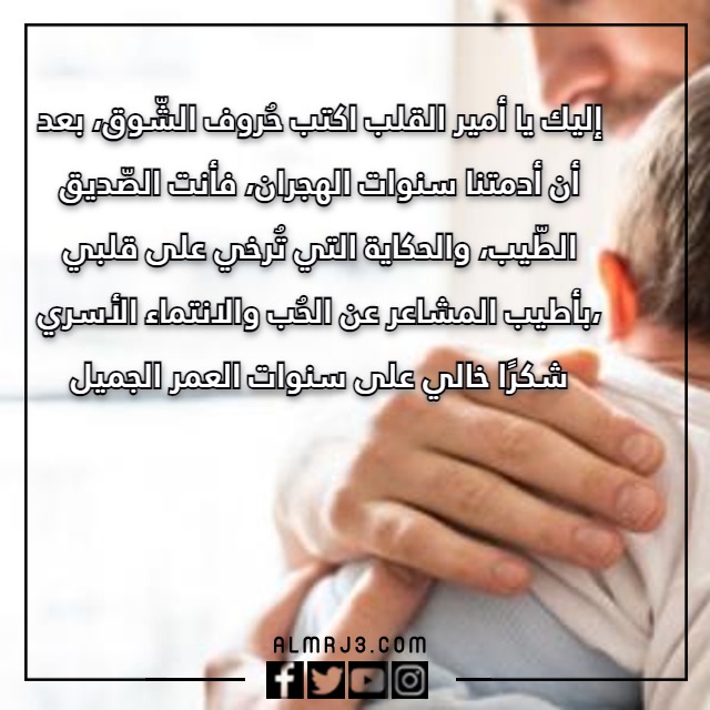 | العبارة الرّابعة | إليك يا أمير القلب اكتب حُروف الشّوق، بعد أن أدمتنا سنوات الهجران، فأنت الصّديق الطّيب، والحكاية التي تُرخي على قلبي بأطيب المشاعر عن الحُب والانتماء الأسري، شكرًا خالي على سنوات العمر الجميل. |