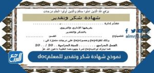 نموذج شهادة شكر وتقدير للمعلم 2025 doc
