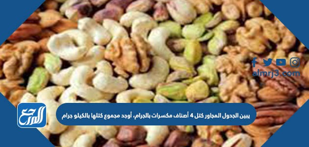 يبين الجدول المجاور كتل ٤ أصناف مكسرات بالجرام، أوجد مجموع كتلها بالكيلو جرام