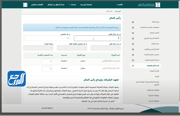 - الانتقال لتحديد رأس مال الشركة النقدي والكلي كما هو موضح في الصورة.