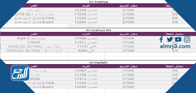 ولمن يبحث عن تردد قناة الحدث HD يمكنكم الحصول عليه من الجدول التالي: