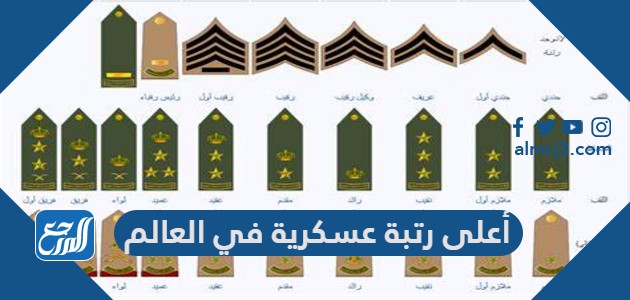أعلى رتبة عسكرية في العالم والتي تكون بمثابة المرتبة والرتبة التي لا يعلوها رتبة أخرى في القوات المسلحة أو بالجيوش النظامية في العالم، والتي يخول لها اتخاذ القرارات وإصدار الأوامر النهائية في أوقات الحروب والأزمات، وهناك فئة كبيرة من البشر في العالم لم يلتحقوا بالخدمات العسكرية أو الجيوش النظامية في دولهم، وتجدهم يبحثون من آن لآخر عن الرتب العسكرية في العالم، وحول هذا الشأن سنتطرق عبر هذا المقال المُقدم من موقع المرجع للإجابة عن أعلى رتبة عسكرية في العالم ومهامها، وبعض التفاصيل الأخرى المتعلقة برتب ومهام الجيوش.