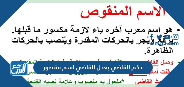 حكم القاضي بعدل القاضي اسم مقصور، سؤالٌ قد يرد ضمن المناهج التّعليميّة في المدارس المختلفة، وهو سؤالٌ من علم النّحو والصّرف، وهو من القواعد الهامّة الّتي يجب على الطّالب المدرسيّ معرفتها، لذا سيساعدنا موقع المرجع على معرفة إجابة السّؤال الصّحيحة، بالإضافة إلى تعريفنا بالأسماء المنقوصة والممدودة والمقصورة.