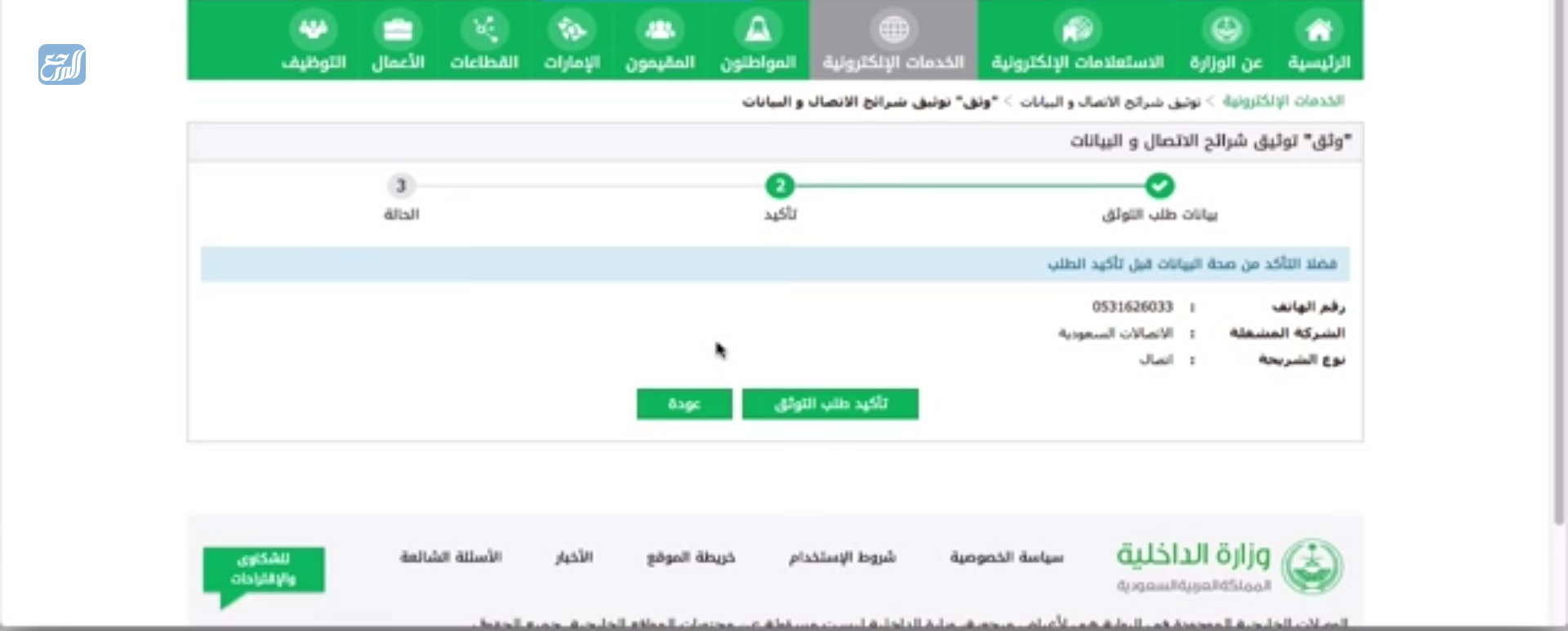 - تأكيد المعلومات برقم التواصل الخاص بالمستخدم والضغط على متابعة كما هو موضح في الشكل أدناه: