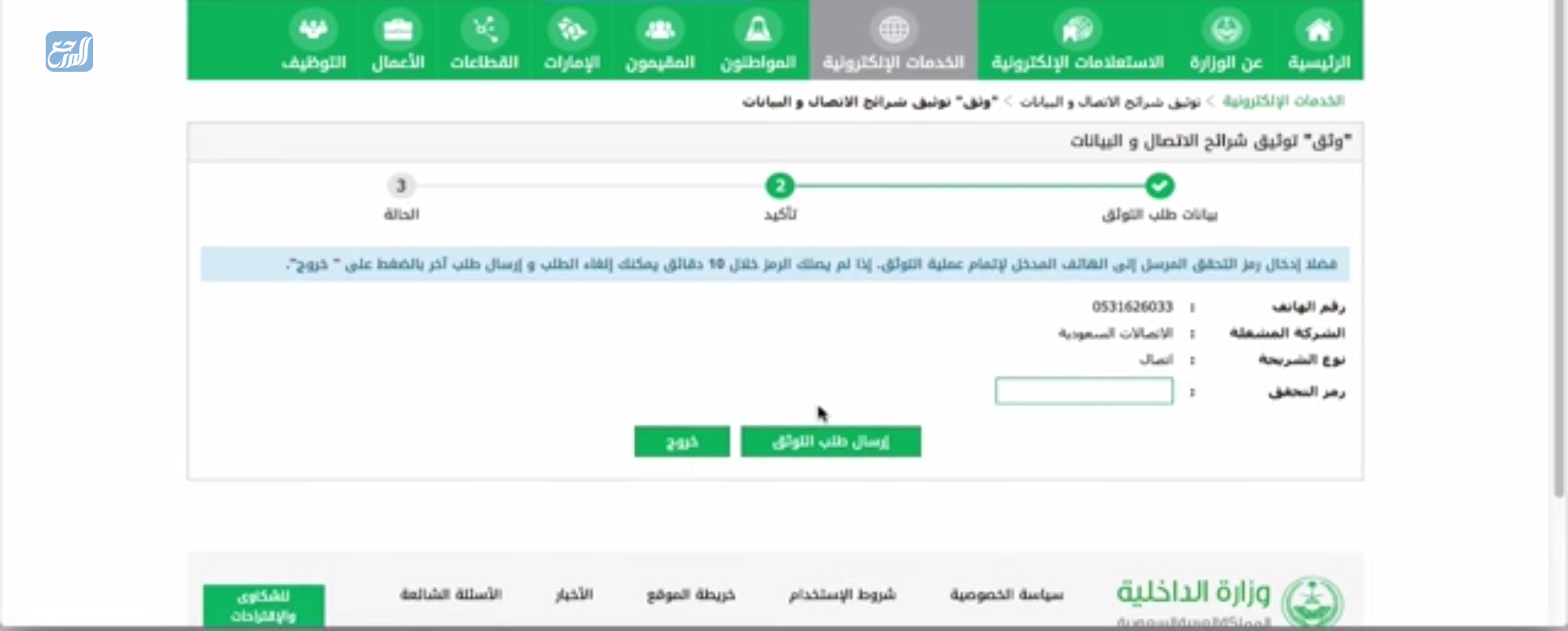 - إدخال رمز التحقق كما هو موضح في الشكل أدناه: