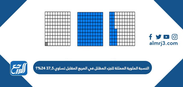 النسبة المئوية الممثلة للجزء المظلل في المربع المقابل تساوي ٣٧,٥ %24؟ تكثر النسب المئوية من حولنا، فكثيراً ما نسمع النسبة المئوية لمعدل السكان في مدينة معينة، أو النسبة المئوية لانتشار وباء ما بين الناس، وهناك النسبة المئوية لنتيجة شخص ما في مادة علمية ما، وغيرها الكثير، ومن خلال موقع المرجع سيتم التعرف على مفهوم النسبة المئوية، وطريقة حساب هذه النسب، بالإضافة إلى بعض الأمثلة عليها.