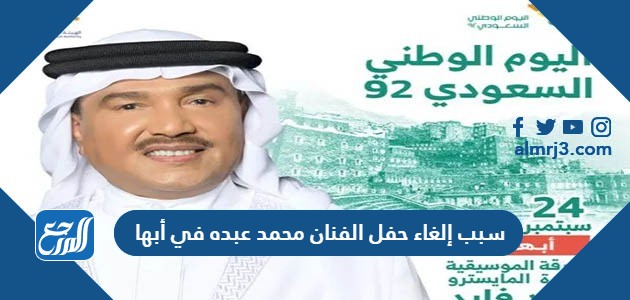 سبب إلغاء حفل الفنان محمد عبده في أبها؟ حيث كان من المكرر تدشين حفل غنائي وطني للفنان محمد عبده في أبها خلال العيد الوطني السعودي 92 لعام 2022 / 1444، لكن ذلك الحفل تم إلغاؤه بسبب ظروف غامضة سوف نتعرف عليها من خلال موقع المرجع، كما سوف نتعرف على الفنان محمد عبده، بالإضافة إلى سيرته الذاتية، وكم عمر الفنان محمد عبده، وما قدمه من أعمال فنية عدة.