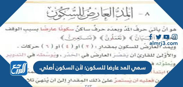 يعرف علم التجويد بالعلم الذي لا يمكن أن يقف على حرف متحرك وأيضًا لا يمكن أن يتم البدء بحرف ساكن، كما يُعرف المد العارض للسكون بأنه وقوع الحرف الساكن سكونًا عارضًا من أجل الوقف بعد حرف اللين أو المد، حيث يُعد حكمه جائزًا، ويكون مقدار المد فيه بمقدار حركتين أو أربع أو ست حركات، ومن الأمثلة عليه: قال الله -تعالى-: (الرَّحْمَنُ)[3]، وفي قوله تعالى: (كَلَّا بَلْ تُكَذِّبُونَ بِالدِّينِ)[4]، بعد أن تعرفنا على تعريف المد العارض للسكون الذي يُعتبر نوع من أنواع أحكام المد التي تكون بسبب السكون نتوقف هنا لحل سؤال سمي المد عارضا للسكون؛ لأن السكون أصلي، وفي ما يلي سيتم توضيح الإجابة الصحيحة له:[5]