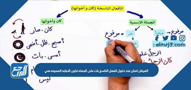 الفرخان امنان عند دخول الفعل الناسخ بات على الجمله تكون الاجابه الصحيحه هي، هذا ما يهتم موقع المرجع في تسلّيط الضوء عليه وإيضاحه، وتقدّيم نبذة تعريفية عن الأفعال الناسخة وما تقوم بتغييره عند دخولها على الجملة الاسميّة، بالإضافة إلى شرح أنواع الجمل في اللغة العربية وذلك للمساعدة على التفرقة بين أنواع الجمل بسهولة، والتمكّن من كتابة جمل عربية بطريقة صحيحة نحويًا.