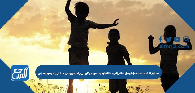في ختام مقالنا بعنوان تسابق ثلاثة أصدقاء ، فإذا وصل سالم إلى خط النهاية بعد فهد، وكان كريم آخر من وصل، فما ترتيب وصولهم إل، وضنا تعريف الترتيب التصاعدي وما هو الترتيب التنازلي وإجابة السؤال المطروح عن ترتيب المتسابقين من الأسرع وحتى الأخير.