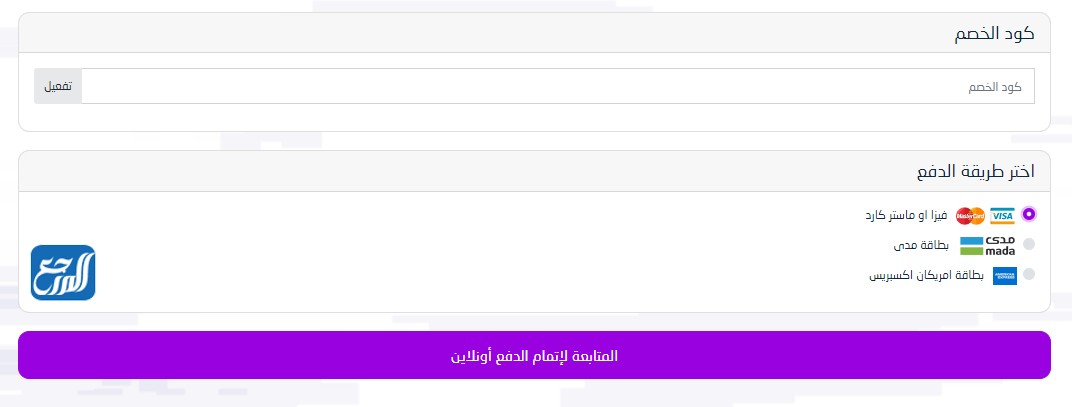 - تحديد طريقة الدفع المناسبة من الخيارات المتاحية، وإدخال كود الخصم إن وجد.