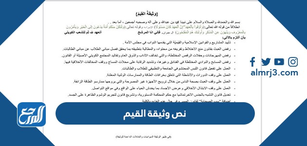 يمكن قراءة أهم بنود ونصوص وثيقة القيم التي تم طرحها من قبل بعض الجماعات الإسلامية في الكويت من خلال تحميلها بصيغة pdf مباشرة “من هنا” حيص تضمنت الوثيقة 13 بند موافق للدستور الكويتي ومبادئ الدين الإسلامي.