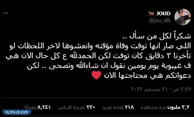 “شكراً لكل من سأل.. اللي صار أنها توفت وفاة مؤقته وانعشوها لآخر اللحظات لو تأخرنا ٣ دقايق كان توفت، لكن الحمد لله ع كل حال الآن هي فغيبوبة يوم يومين نقول إن شاء الله وتصحى.. لكن دعواتكم هي محتاجتها الآن”