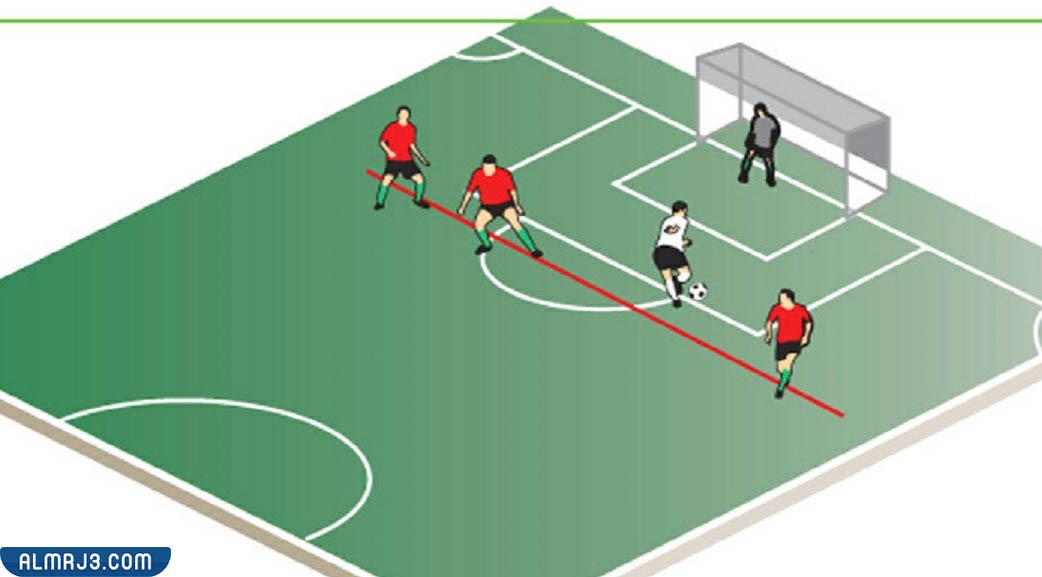 - ثالثاً: أن يكون بين اللاعب المهاجم وبين خط المرمى لاعب واحد فقط من الفريق المنافس، وقد يكون هذا اللاعب هو حارس المرمى، وقد يكون آخر لاعب أمام المهاجم هو أحد مدافعي الفريق المنافس.