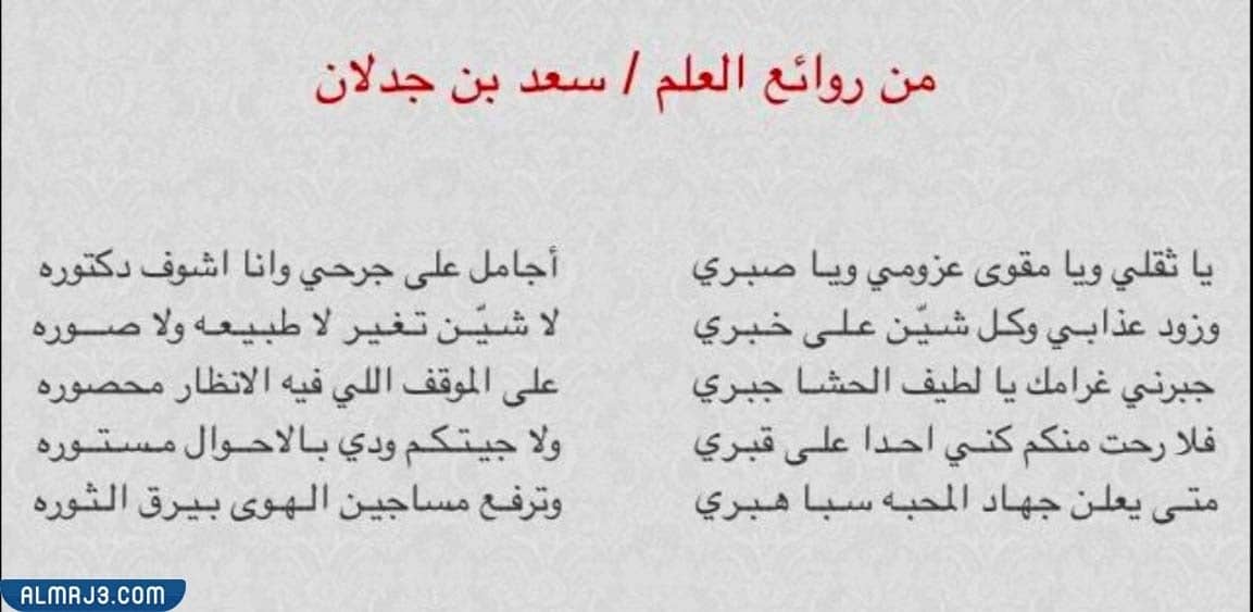 من القصائد التي كتبها الشّاعر السّعودي سعد بن جدلان، وهي من قصائد الشّعر النّبطي المنسوب إلى لهجات الخلج العربي والمملكة العربيّة السّعوديّة، حيثُ نالت هذه القصيدة على إعجاب النّقّاد والمثقّفين من الشعب السّعودي والخليجي بشكل عام، لما تُعبّر عنه من خلال كلماتها عن عزّة نفس العاشق وتلك المعاناة التي يعانيها في سبيل الحب والمحبوبة، وقد ذكر اسم الإعلامي الشهير سبأ باهبري في قصيدته.