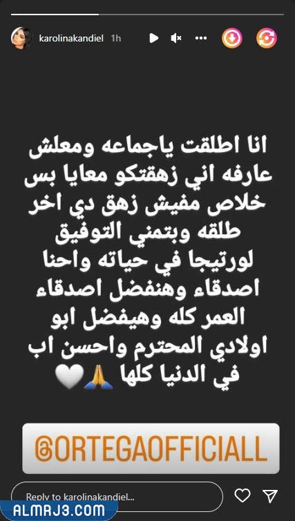 أعلنت كارولينا قنديل انفصالها الثالث والأخير عن أورتيجا عبر حسابها الرسمي بانستقرام، بعدما قامت بحذف جميه الصور العائلية المشتركة، كما رفضت التطرق لأسباب الانفصال الأخير واكتفت بتوجيه كلمات مؤثرة لزوجها السابق؛ منوهةً لطيب العلاقة بعد الانفصال وأنّ الزوجين باتا مجرد صديقين، وعلّقت على طلاقها بمنشور في انستقرام كما يلي: