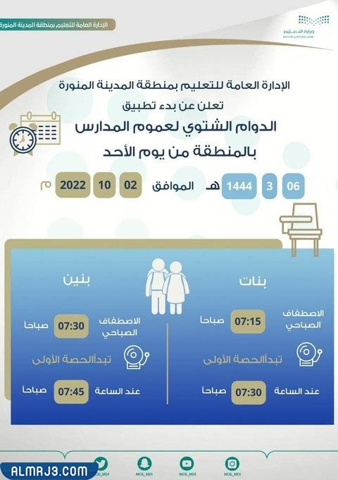 متى يبدأ الدوام الشتوي للمدارس 1444 المدينة المنورة