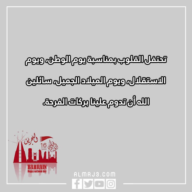 - بمناسبة اليوم الوطني لدولة البحرين، نُبارك لقيادتنا الحكيمة، ونسأل الله أن تدوم علينا هذه الأفراح، وأن لا نرى في وطننا وشعبنا سوءًا بإذن الله تعالى.